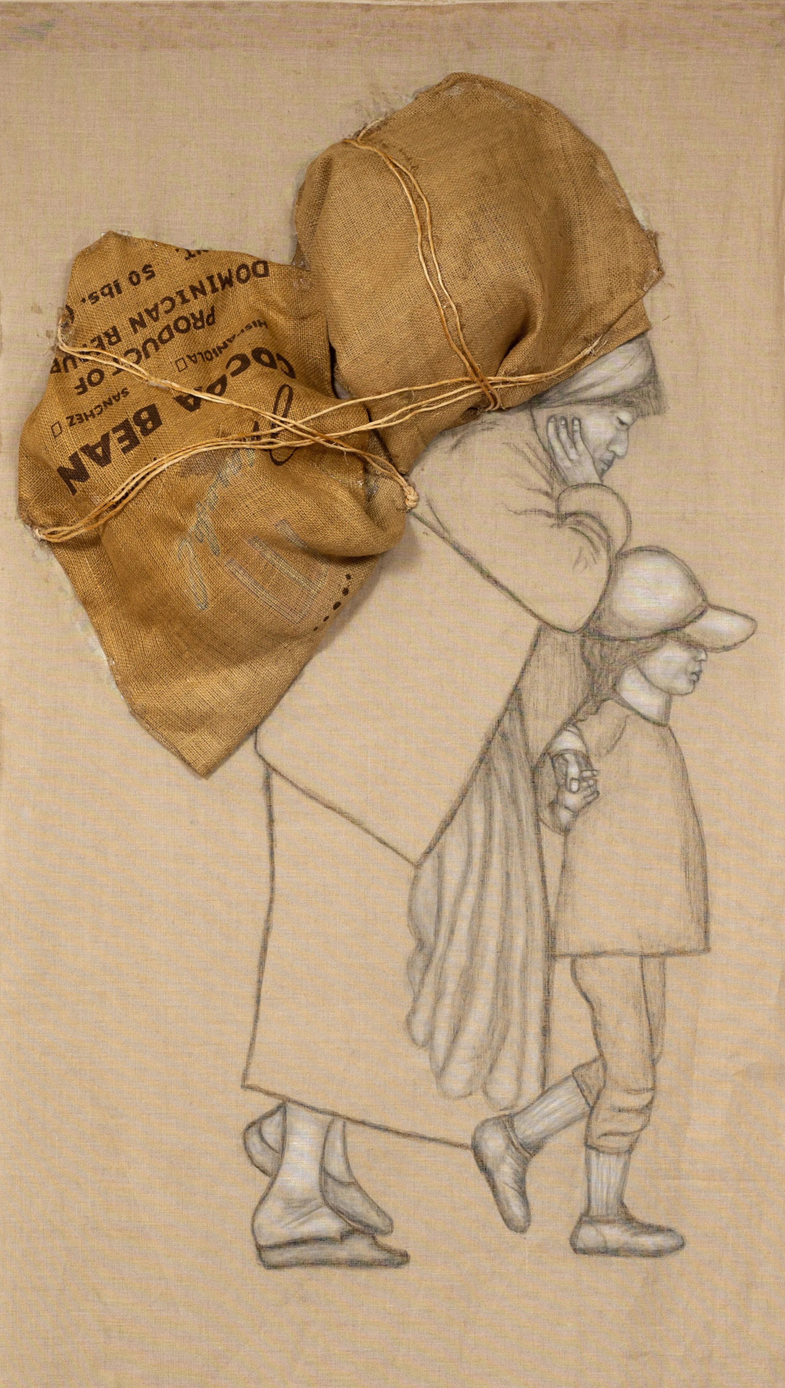Pam Douglas’ multi-year Sanctuary project began as a visceral, loving response to refugees seeking sanctuary around the world. It has grown into a metaphor for all of us in the winds of change. Entering Part One of Sanctuary a visitor is immersed in life-size drawings with sculptural elements draped ceiling to floor behind a chain link fence. These walking figures are parents seeking refuge and children caged behind ropes. The installation makes the viewer a witness to their journey. CLICK HERE to view the exhibit.
