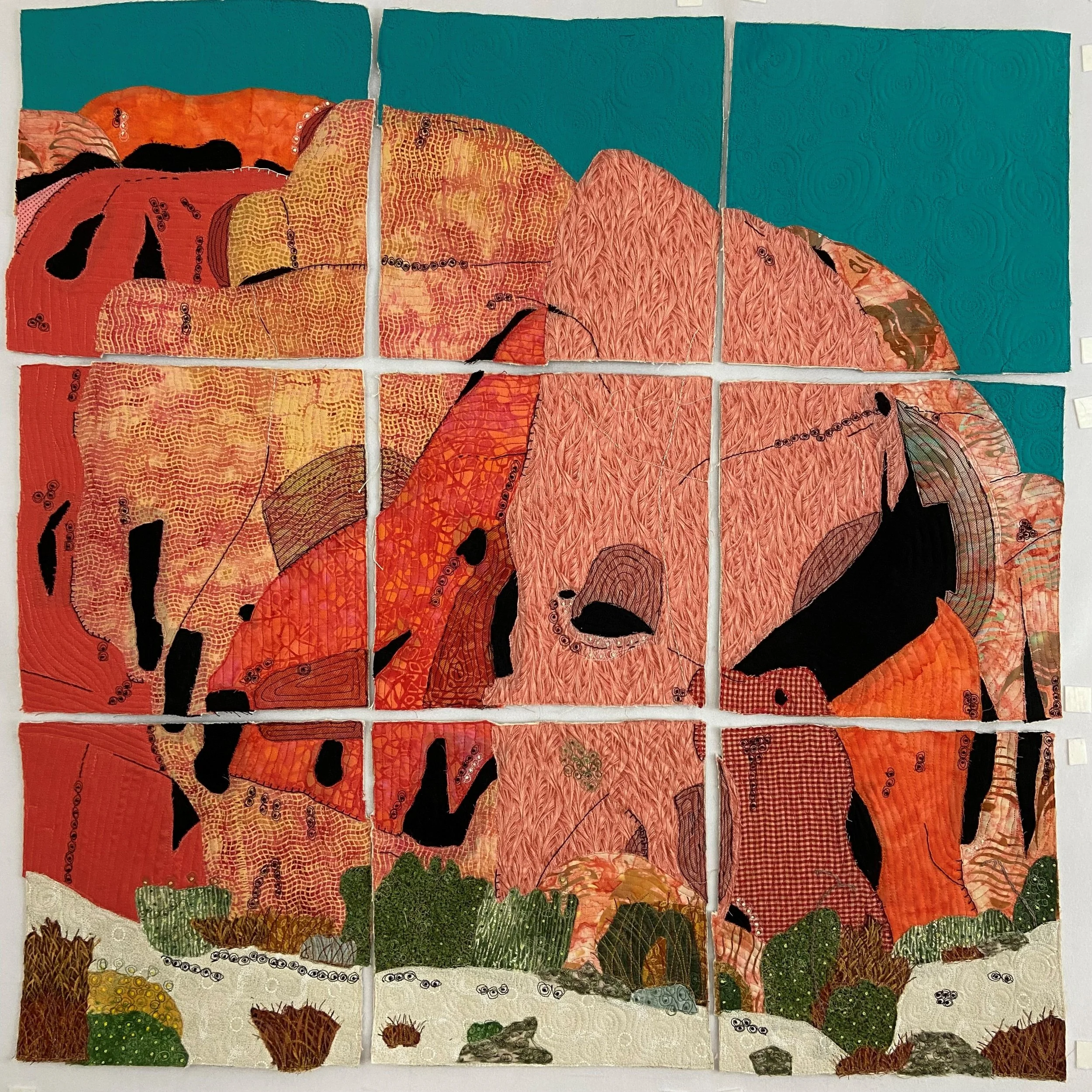 Deborah McAfee uses textiles and stitching to recreate the textures, colors, and occasional moments of stillness in the Southern California environment. With her new exhibit Desert Sanctuary, McAfee starts by taking photographs of nature. She selects certain photographs, cuts them into structural fragments, and re-presents those fragments with pieces of fabric. McAfee then adorns the images with embroidery and stitches them into a quilt-like whole, recreating the California landscape from its geometric components.