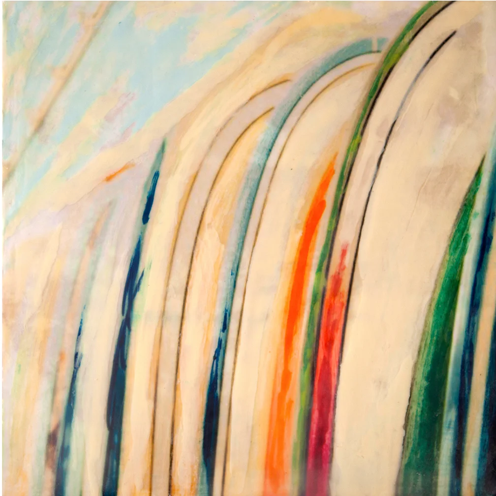 I started working with encaustics because I love the blending and flow of the hot wax with all kinds of medium. Heating, scraping and working in photographs, oils, pigment sticks, pastels. The hot molten wax allows me to layer and discover something new in every art piece created. I work out of my studio at home in the Santa Monica Mountains allowing me the inspiration of the nature and beauty around me.
