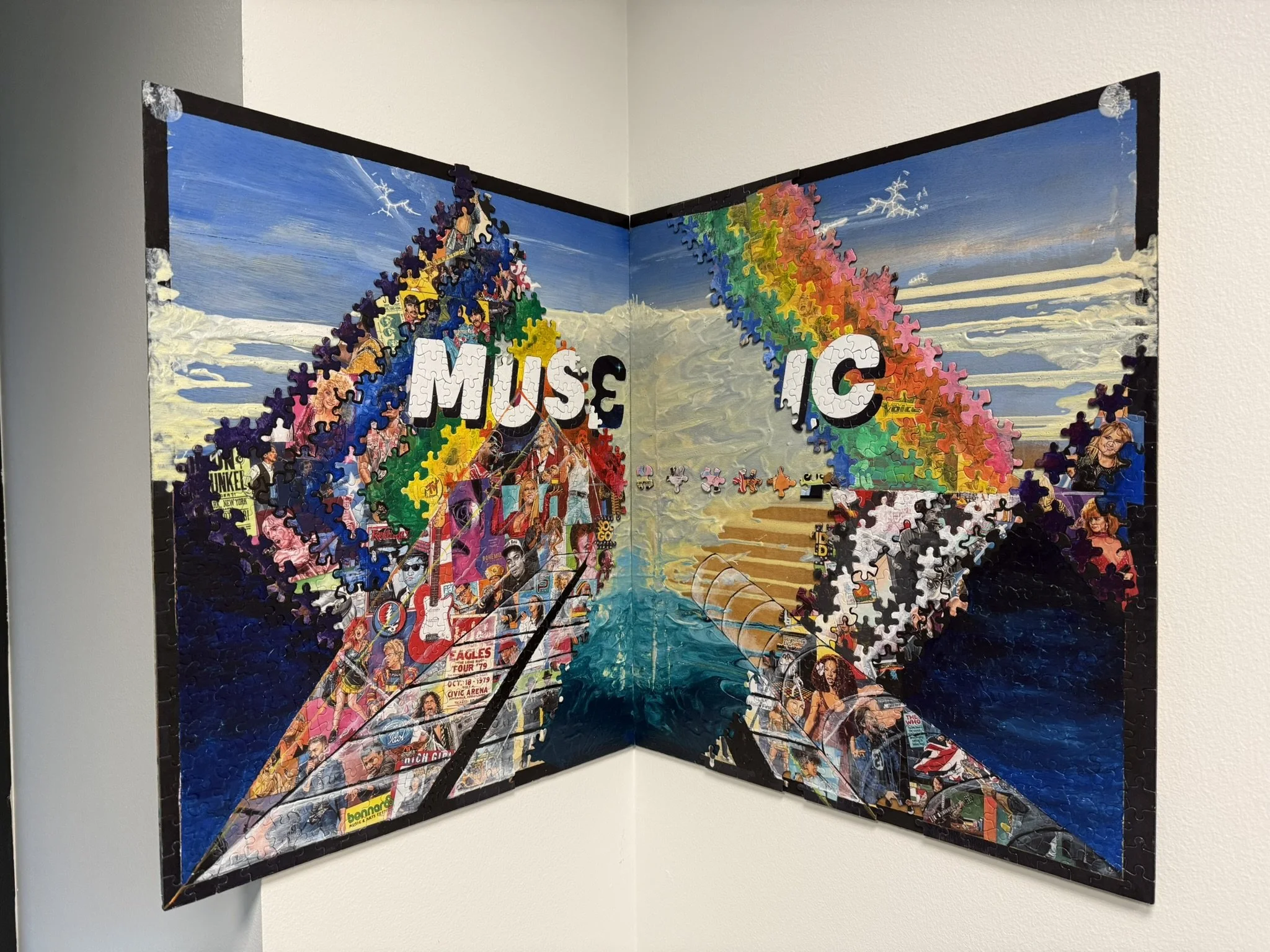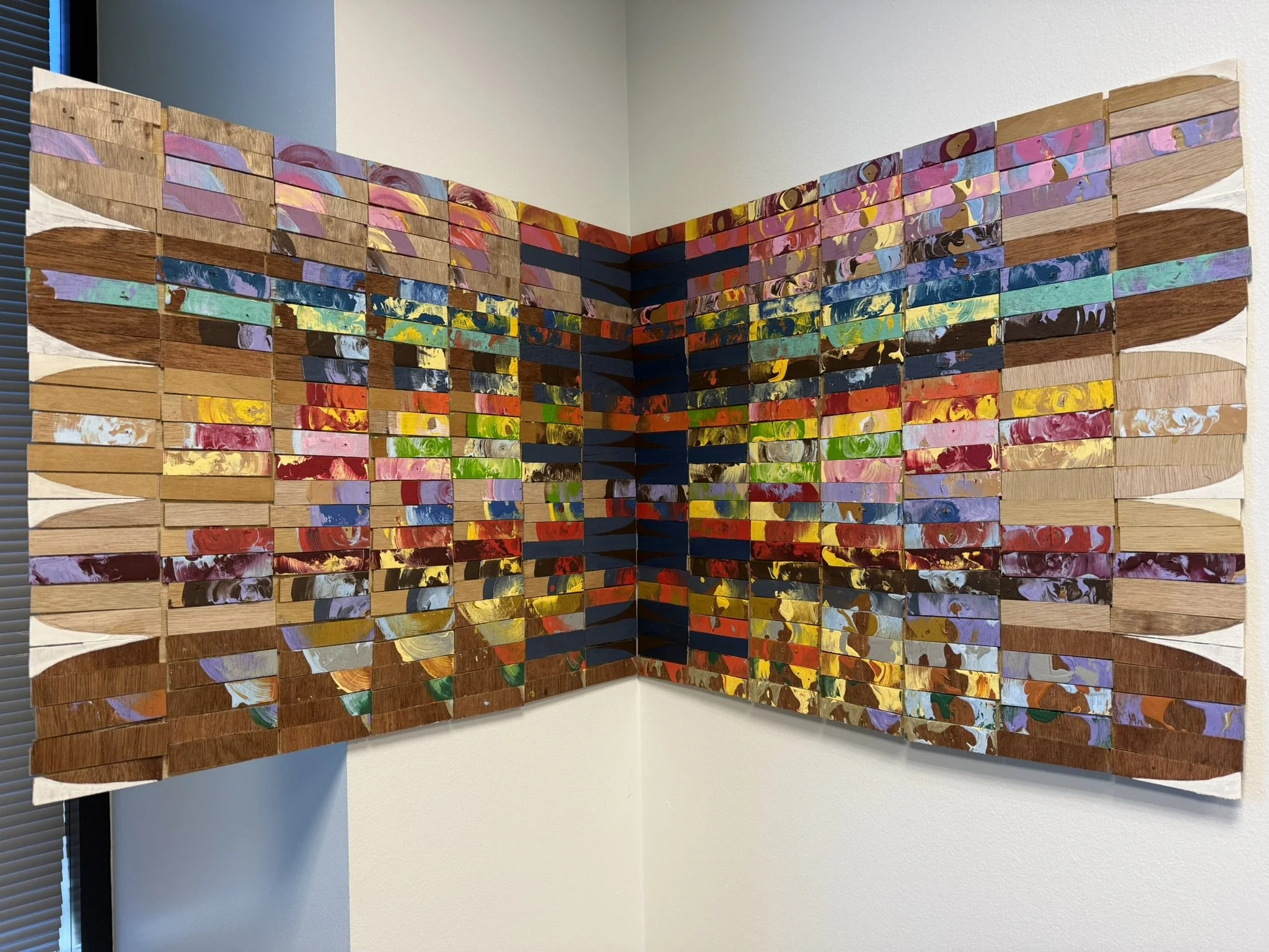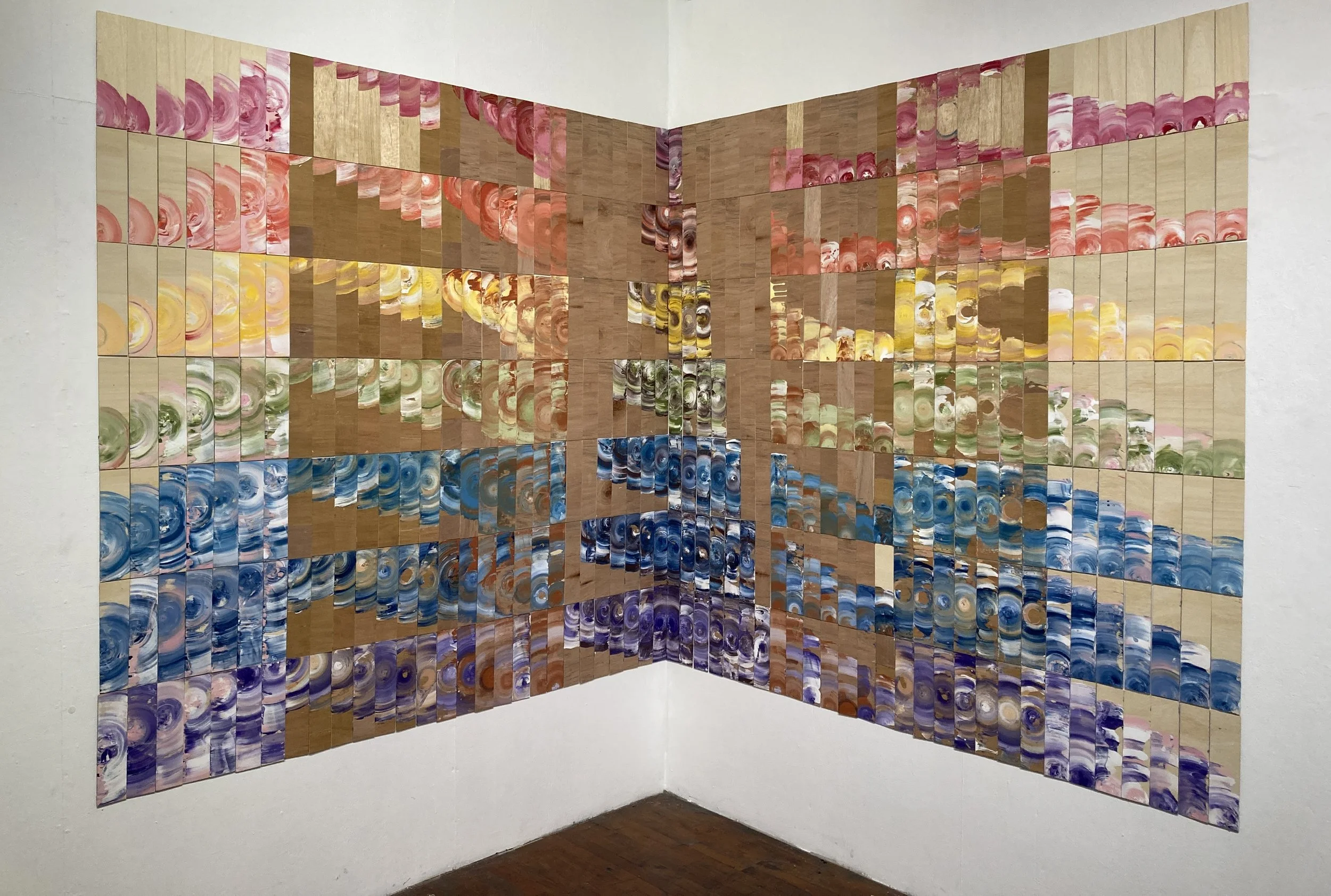 The general pursuit of the artist is depicting the sublime, not only in basics like nature and math but also in pop culture. Ms. Lynn Lee Wong is liberal in utilizing math, pop imagery, and non-traditional art tools such as jigsaw puzzles. She integrates symbols, pop culture imagery, and the creative process. People work with information via language and symbols, ex: numbers, graphs, and visuals 2D or 3D. The artist applied paint in between rectangular wood pairs and rotated the pairs about a nail holding them together (see video on website). The nail position is varied based on equations of the line (in the Pigment Series) and the circle (in the Sun series). The combination of opposites is a theme. She chose colors from the presence and absence of light, color pigments of human skin, and the changes of color in a life cycle from birth to death. The chaos of viscous paint and the order of math, irreversibly unify. Through art, the artist explores unexpected deep meaning and expression about our relationship with the world, nature, and what lies beyond.