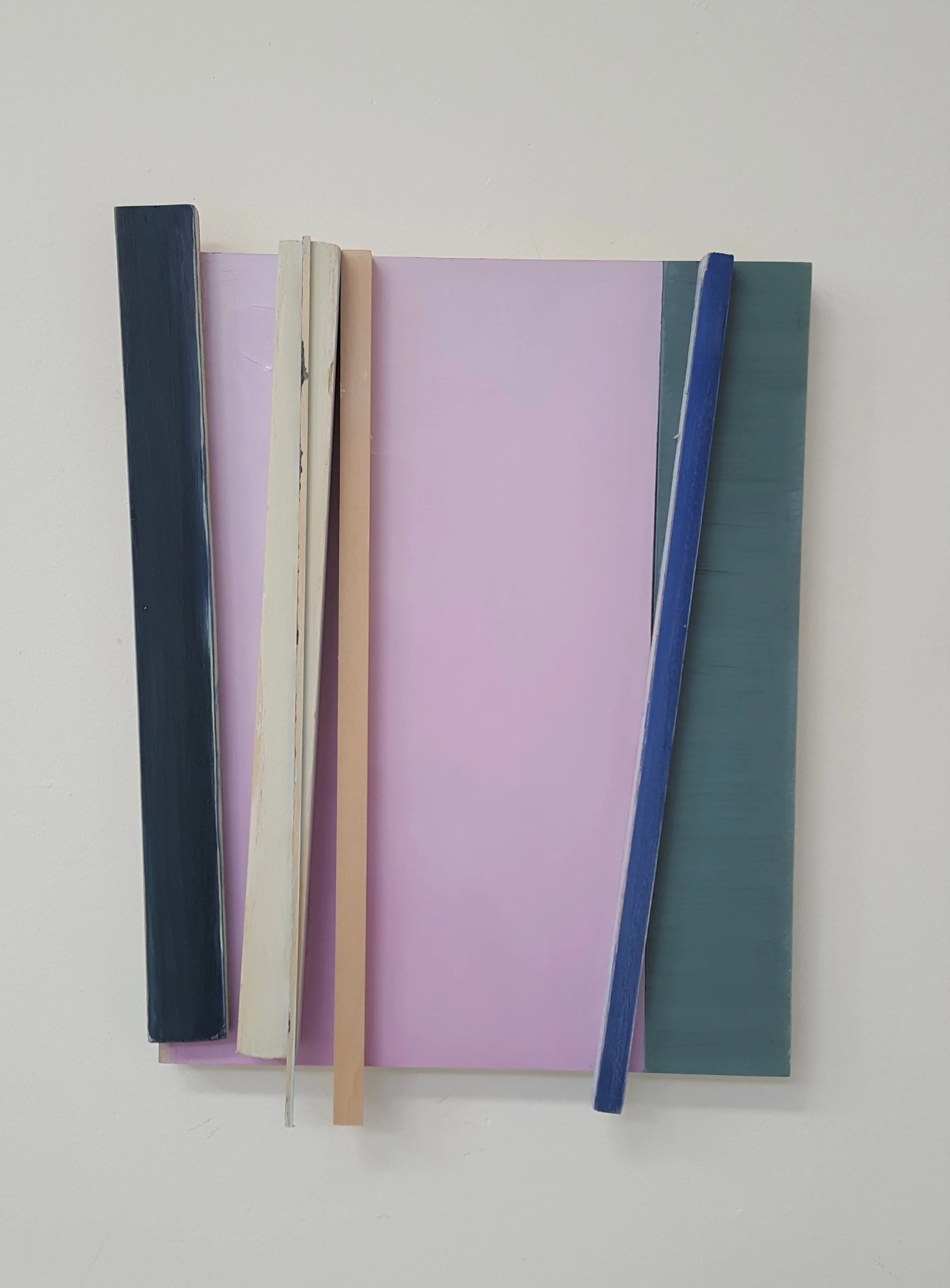 Integrated, hand in hand, with these thoughts is the constant process of arranging and constructing painted wood panels and pieces. The wood brings with it a solidity, presenting architectural edges, corners, and frames, often contrasted to a palette softened and muted.